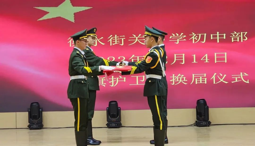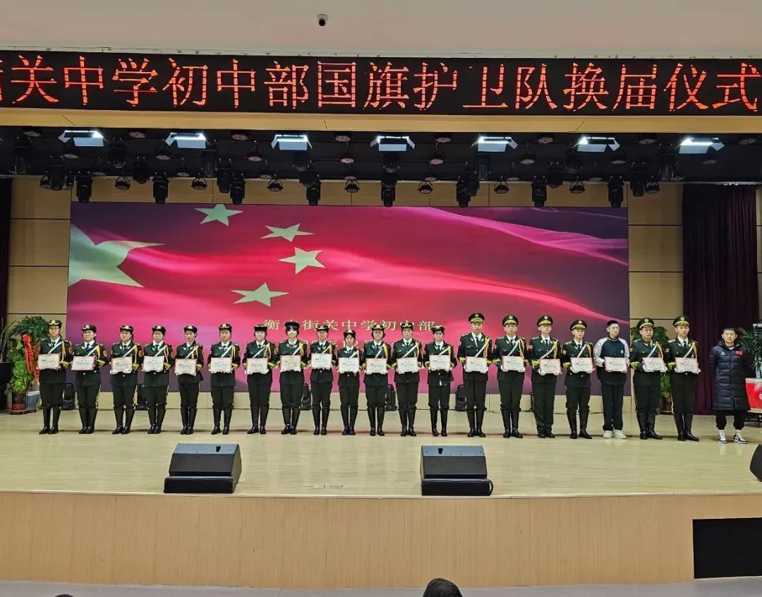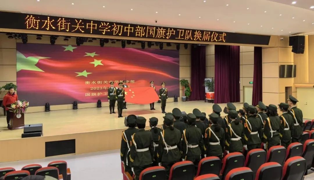随着“起来,不愿做奴隶的人们”的音乐声徐徐上升时,衡水街关中学初中部迎来了一年一度的国旗护卫队换届仪式,夏校长、弓主任、代主任等各位领导出席本次换届仪式。