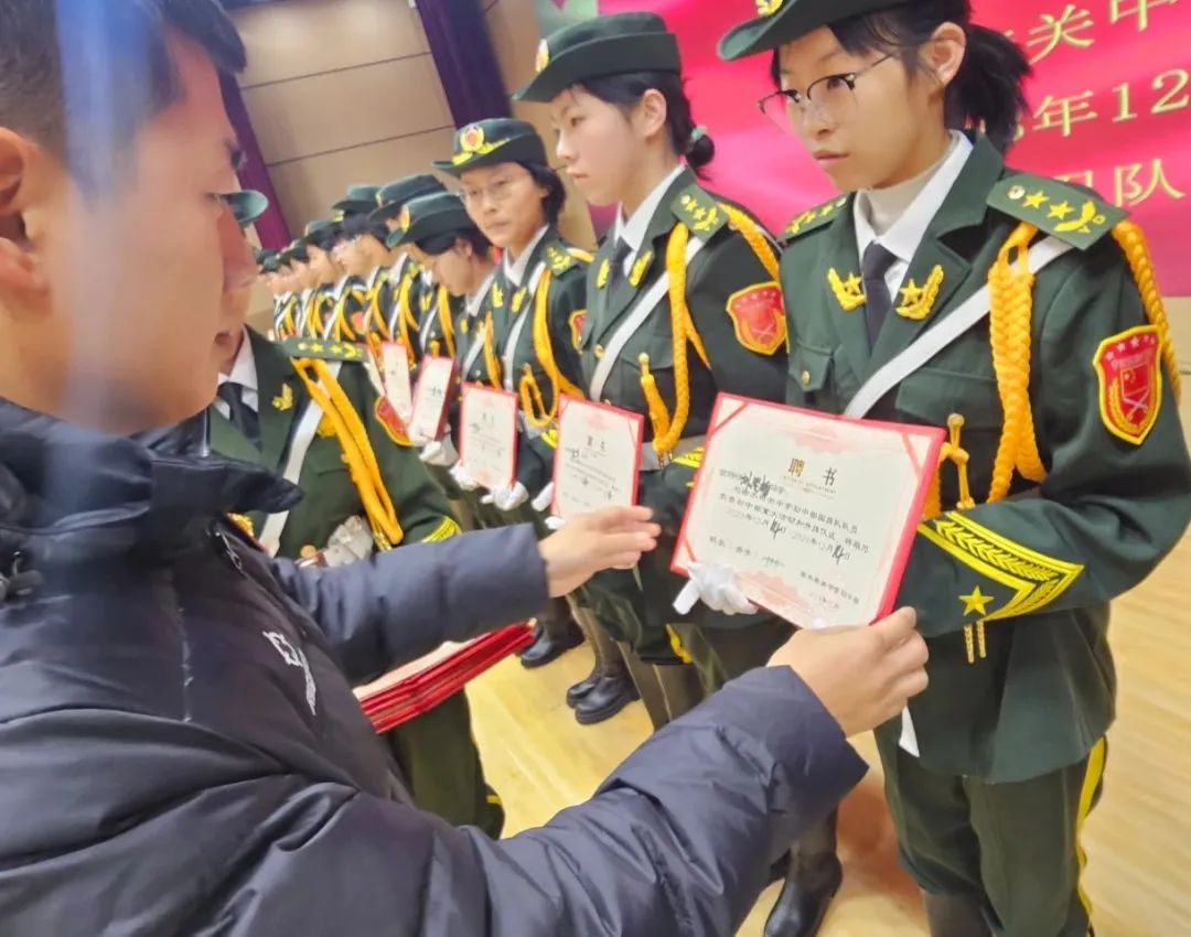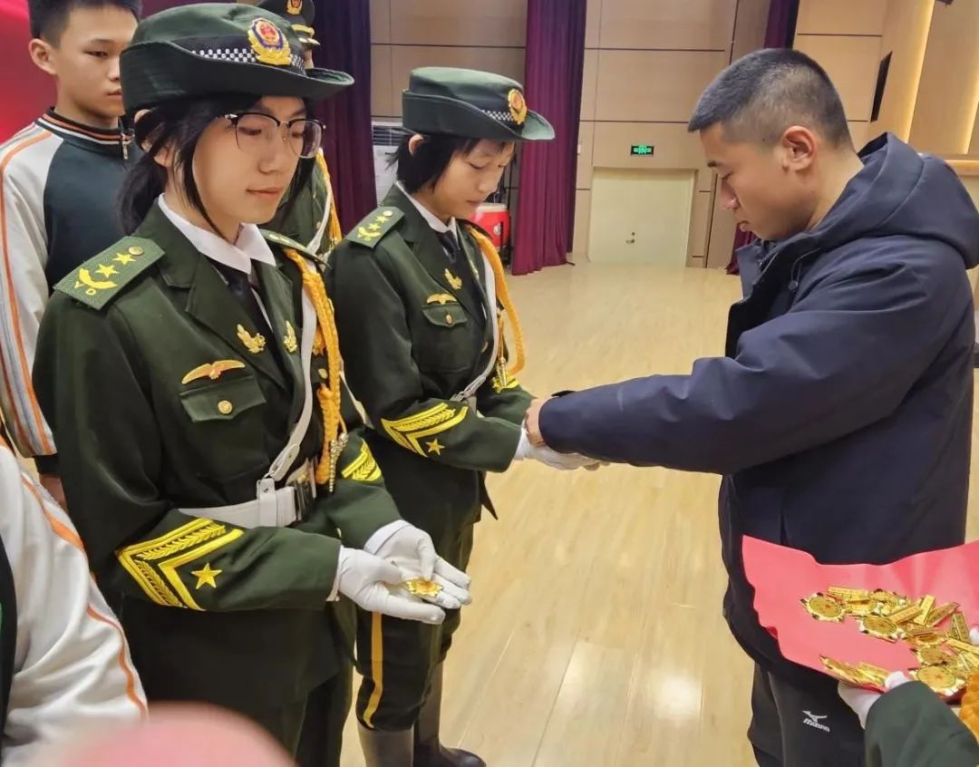 多少个清晨,当我们走过那一段神圣的路程,当我们挺直的脊梁里写满对未来与青春的无限憧憬与幻想,我的心中总是充满骄傲。似乎我们走过的并不是一段短短的路程,而是中华五千年一段长长的辉煌的岁月。代辰瑞、弓鹏飞二位主任分别为国旗护卫队退役和新加入的同学颁发退役奖章和入队聘书。